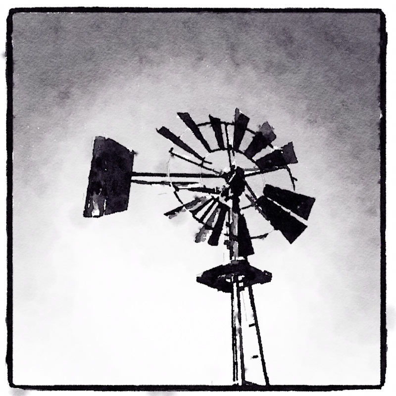 Before the horizon was sentried with white gel-coated wind turbines, these wood and steel wizards alchemized wind into water. Oases emerged, homesteads sprouted, cattle prospered. Many still whirl or grind in the wind, but others resist, strain and groan. And lean. Paddles vanish. Bolts sheer. Weathered letters fade beneath rust.